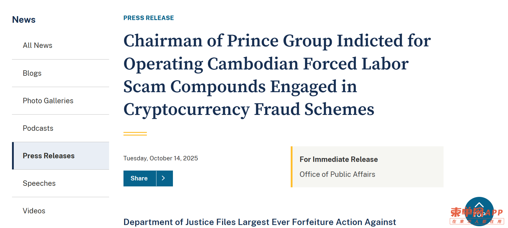 【柬单网综合报道】2025年10月14日,美国司法部、财政部与英国政府同步宣布,对柬埔寨太子集团及其创办人陈志采取刑事起诉与金融制裁措施,并对其关联加密资产发起民事没收诉讼。