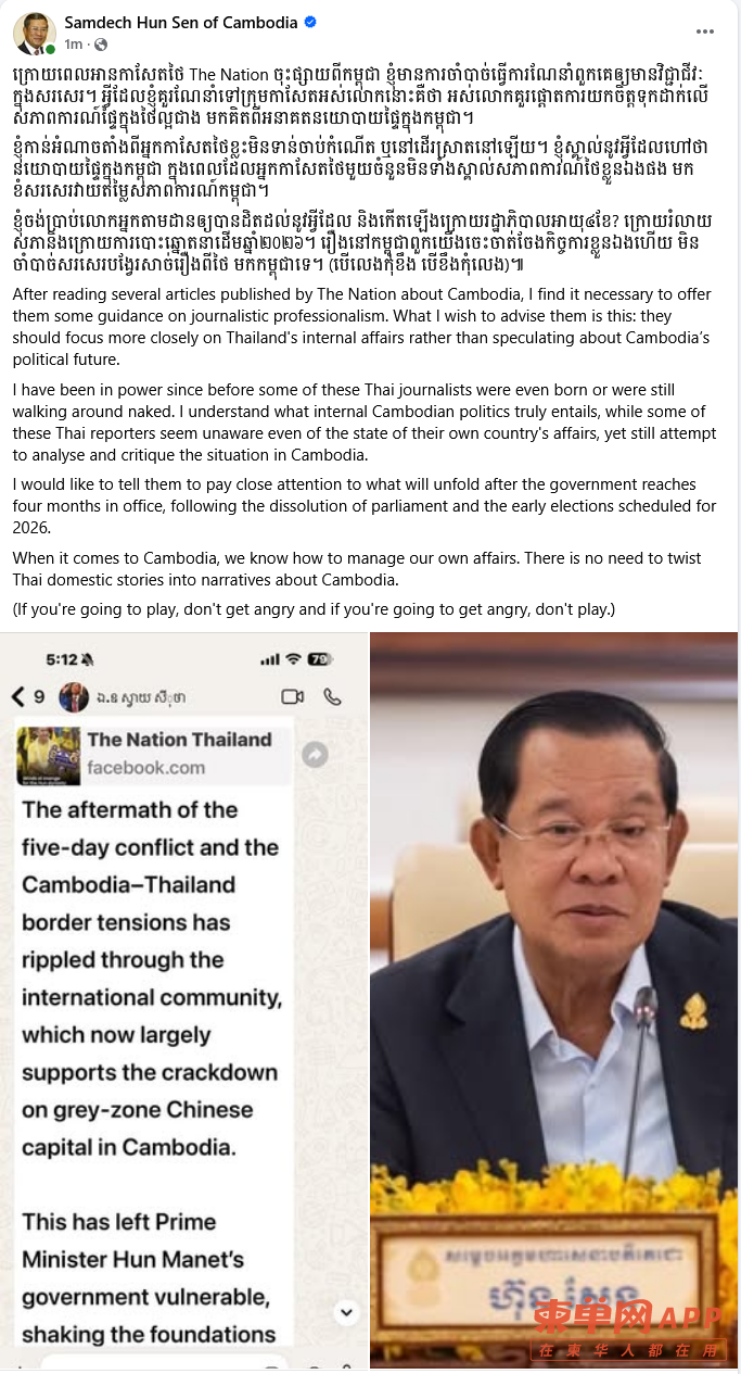 洪森亲王最后强调,柬埔寨有能力妥善处理自身事务,不需要外部舆论干涉。“柬埔寨的事情由柬埔寨人民决定,请不要将泰国的政治叙事套用在柬埔寨身上。”他并引用一句柬语谚语作结:“玩就别生气,生气就别玩。”