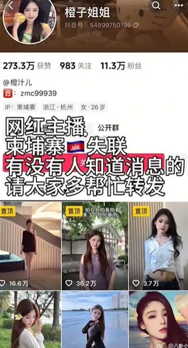 在抖音拥有11万粉丝的网红「橙子姐姐」于11月12日与亲友失联,自称该博主姐姐的网友表示,妹妹原计划13日从柬埔寨飞回中国,如今在西哈努克港失联已超过48小时。如此同时,事主的男友「龙哥」也同步失联,引发了各方的担忧与猜测。