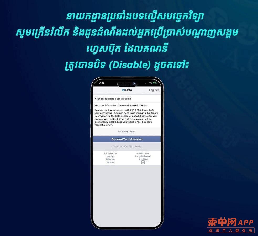 【柬单网综合报道】据柬媒消息,10月18日下午,柬埔寨国家警察总署反科技犯罪局发布通告,提醒广大社交媒体用户,近期因Meta公司系统更新,部分脸书(Facebook)—账号被暂时封禁。警方呼吁公众切勿轻信任何声称可“恢复账号”的私人有偿服务,以免造成经济损失。