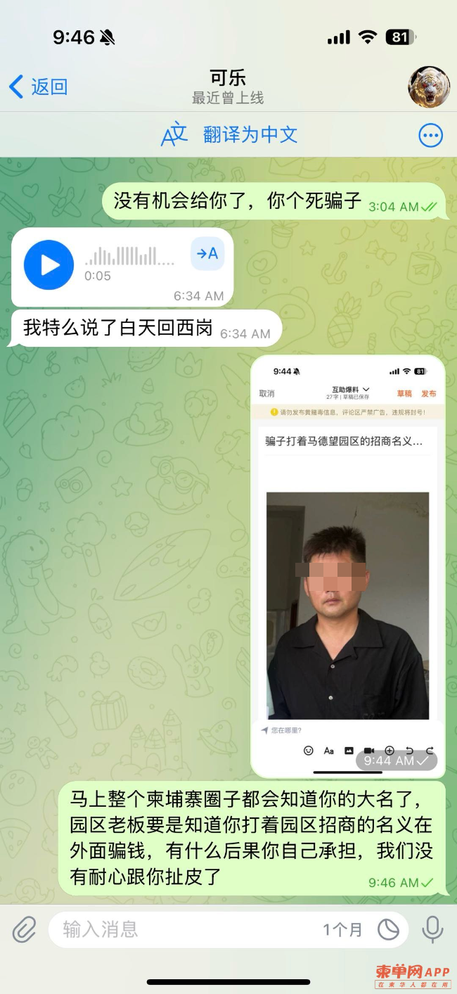 此人叫宋大伟(名字也可能是假的),东北口音,借马德望边境某园区招商名义在外四处骗钱,说自己是园区二老板的小弟,可以走关系在里面做独家生意,超市和游戏厅。也带我们去了园区现场看了商铺,接着从我们手里拿走29500美金好处费和装修款后,承诺15天后进场营业,结果迟迟不能进场,最后以各种理由推脱,后来答应给我们退钱,又是各种理由不到账。大家小心此人,满嘴跑火车,没有一句话是真的