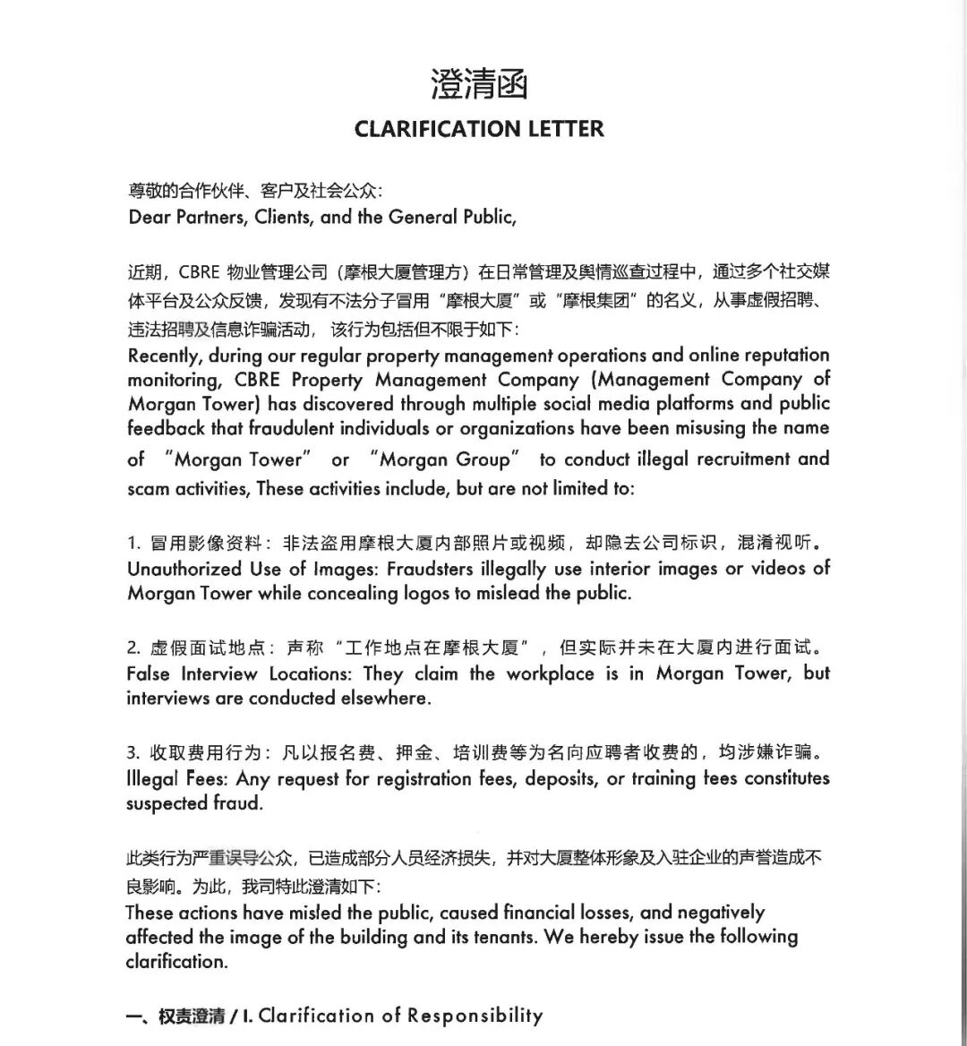 摩根大厦关于冒用我司名义进行虚假招聘的澄清函  关闭 [复制链接]