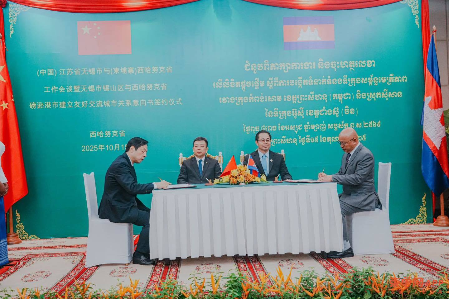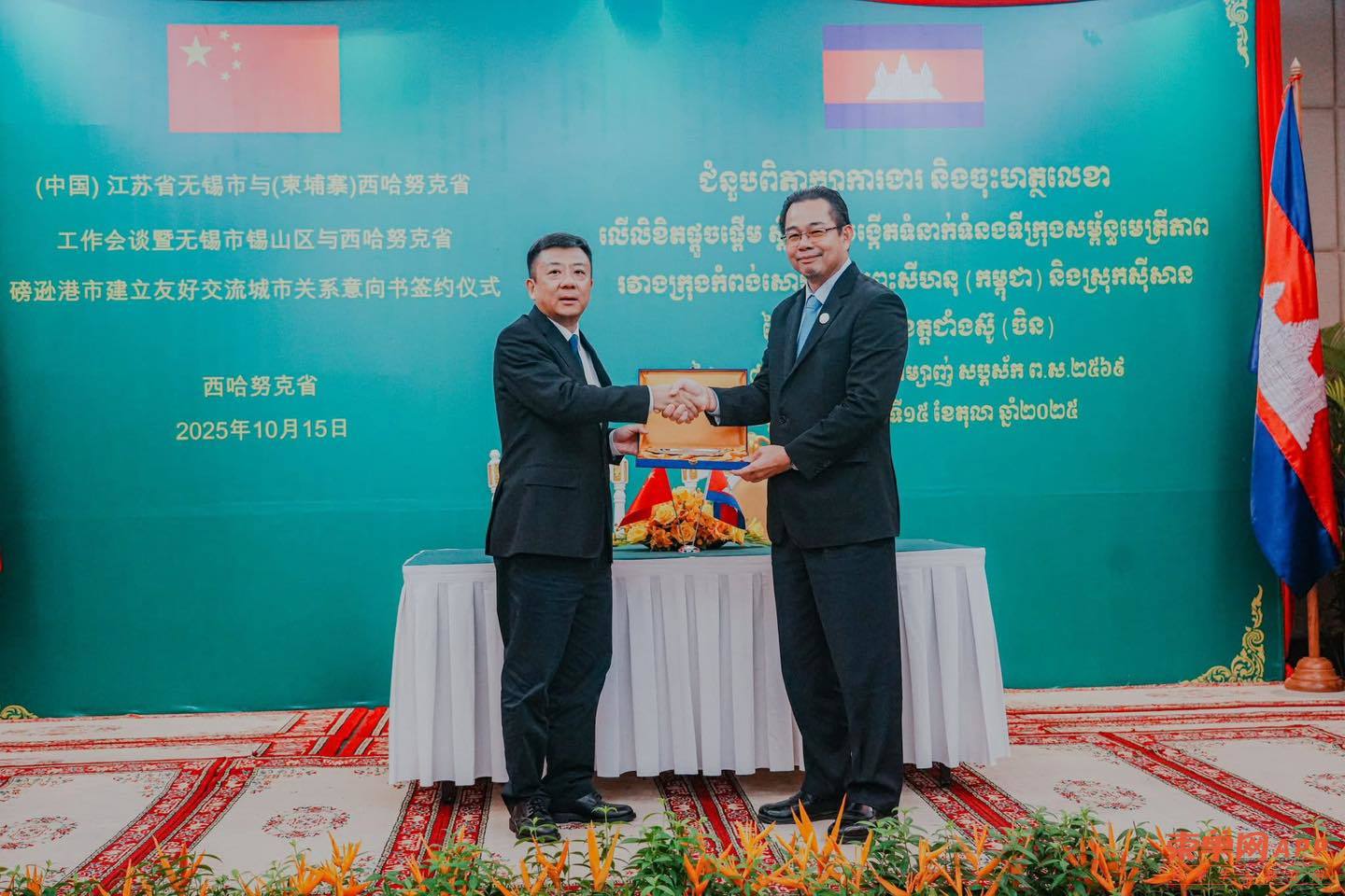 【柬单网综合报道】据柬媒消息,10月15日晚,西港省长蒙西那与中国江苏省无锡市委书记杜小刚共同主持召开工作会谈,并出席《柬埔寨西港省磅逊港市与中国江苏省无锡市锡山区建立友好交流城市意向书》签署仪式。双方正式确认建立友好交流城市关系,标志着中柬地方合作迈出新一步。