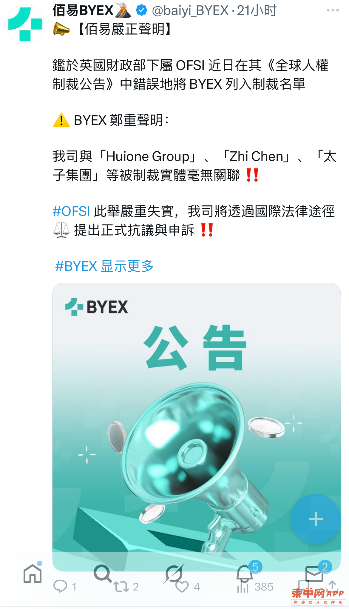 约两小时后,BYEX再度发布声明称,英国财政部下属的金融制裁执行办公室(OFSI)“错误地将BYEX列入全球人权制裁名单”,并强调:“BYEX 与被点名的‘汇旺集团’、‘太子集团’等实体毫无关联,对这一错误指定表示强烈抗议。”