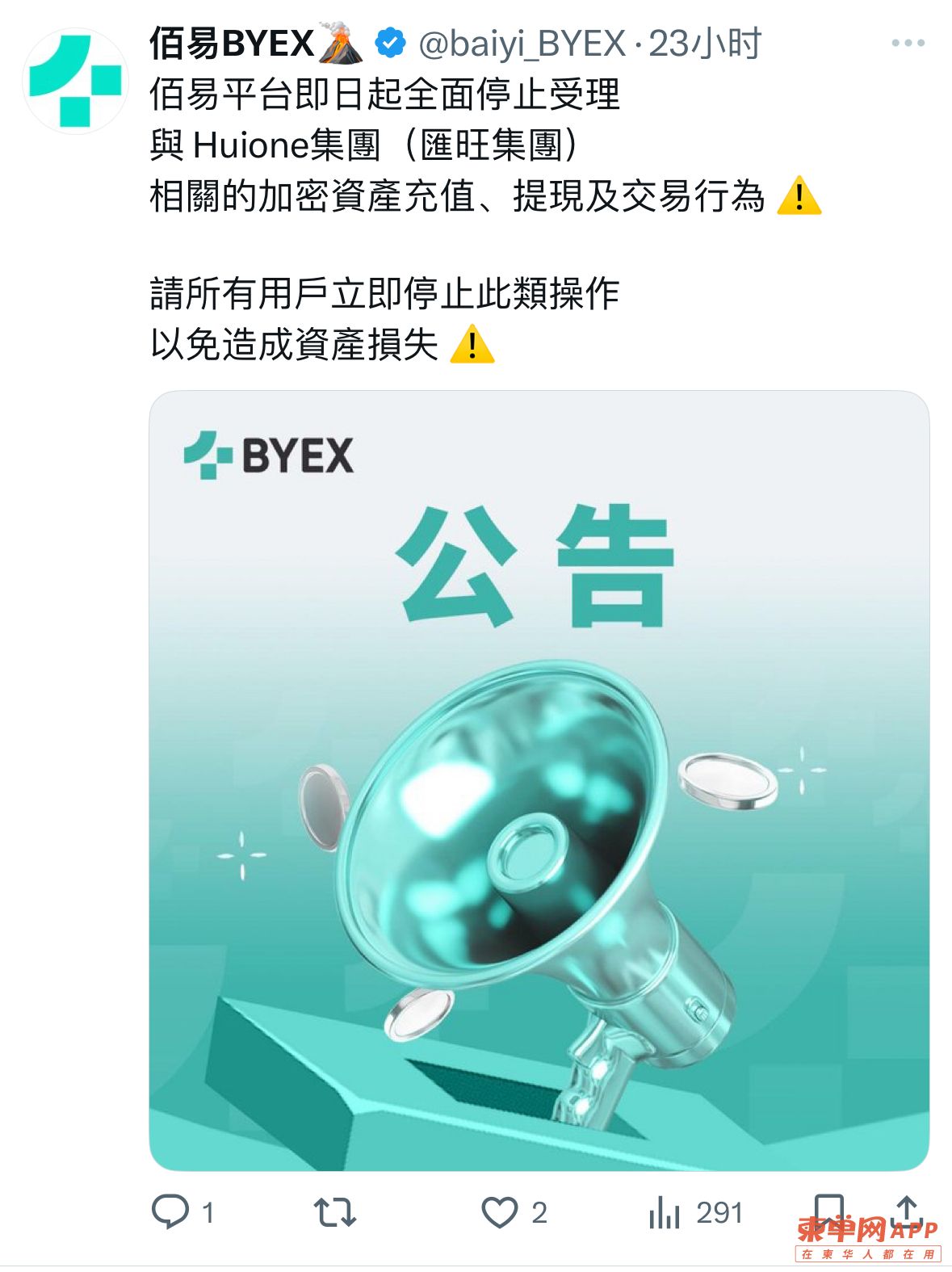 BYEX 于10月15日在其官方X账号发布公告,宣布平台即日起全面停止受理与“汇旺集团”相关的加密资产充值、提现及交易行为,并提醒用户“立即停止此类操作,以免造成资产损失”。