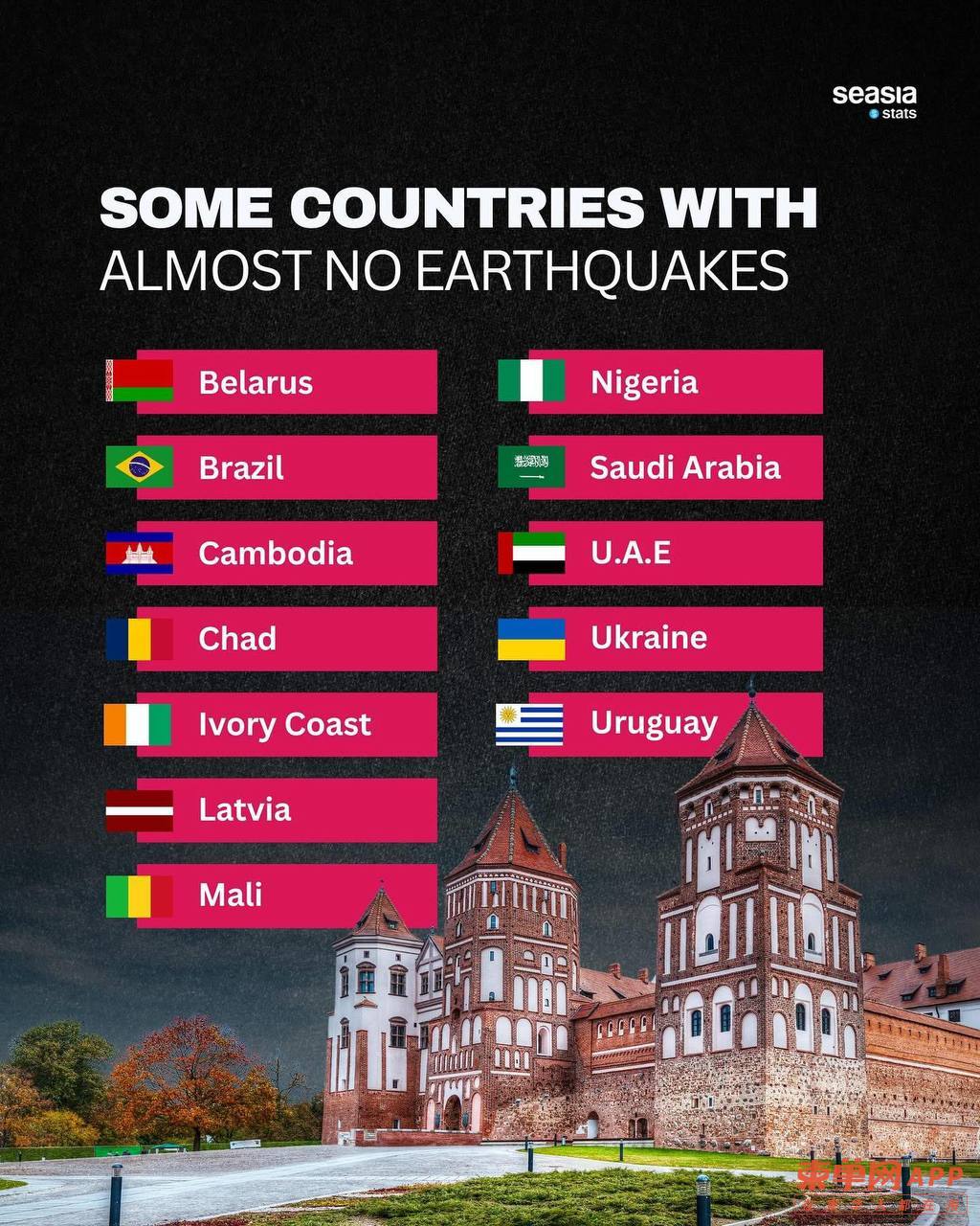 根据数据平台 Seasia 最新发布的统计报告,包括白俄罗斯、巴西和柬埔寨在内的多个国家被列入“全球地震活动最少地区”名单。这些国家地处远离主要地壳板块交界的稳定地带,地质结构坚实,几乎不受地震影响。