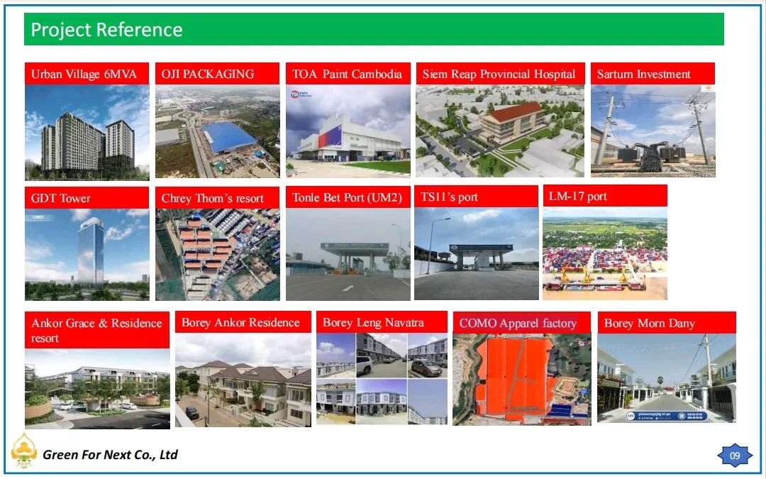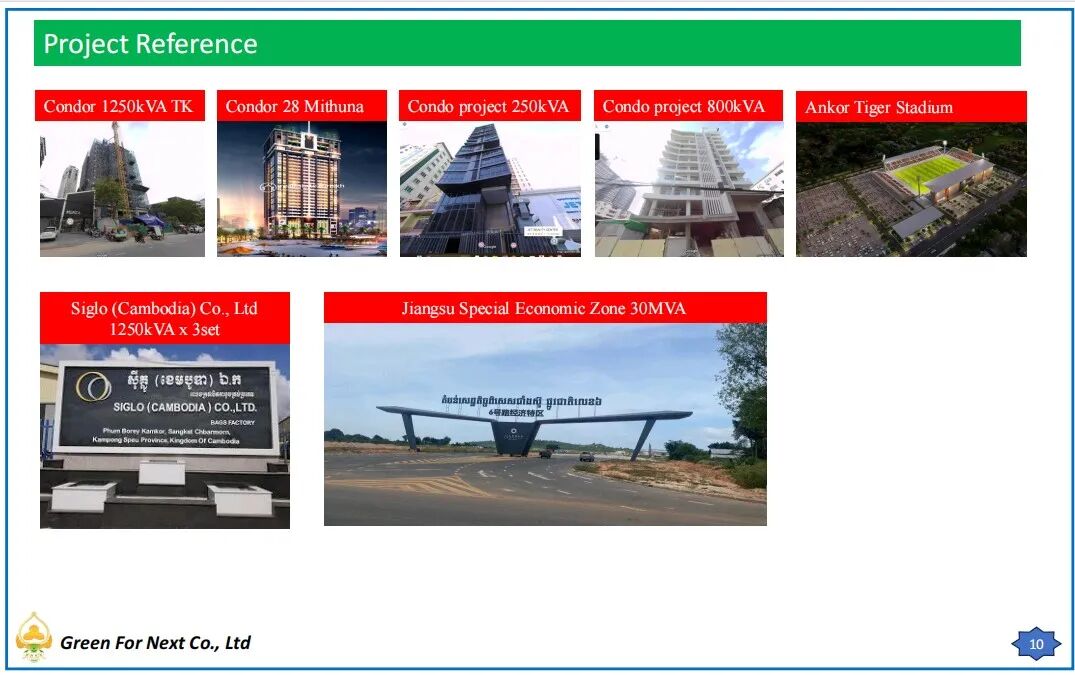 Green for next已为首都·国金、柬埔寨TOA油漆、暹粒省大医院、柬埔寨税务大楼、财通度假村、多功能码头 TS11、COMO 服装工厂、多项知名小区项目提供电力需求。