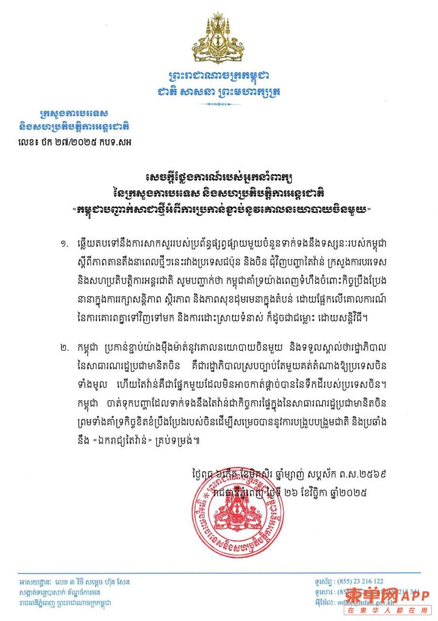 声明指出,近日部分媒体就“日本与中国在台湾问题上的紧张局势”向柬方提出询问。对此,柬外交部强调,柬埔寨支持各方为维护地区和平、安全与稳定所作的努力。柬方认为,区域事务应以相互尊重为基础,通过建设性对话和和平方式解决分歧,避免挑衅与对立,为地区合作与共同发展营造良好氛围。