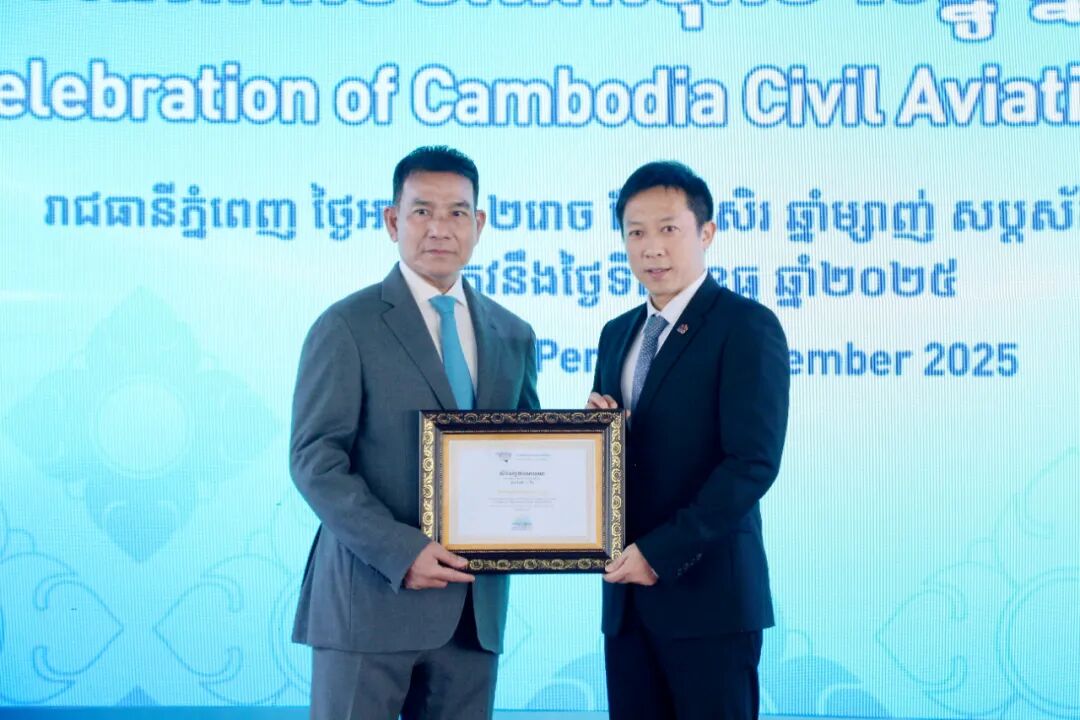 柬埔寨航空董事长兼 CEO Edison Duan 先生在活动开幕仪式上获得了由柬埔寨民航国务秘书处毛哈万纳(H.E. Dr. Mao Havannall)部长阁下亲自颁发的感谢证书。