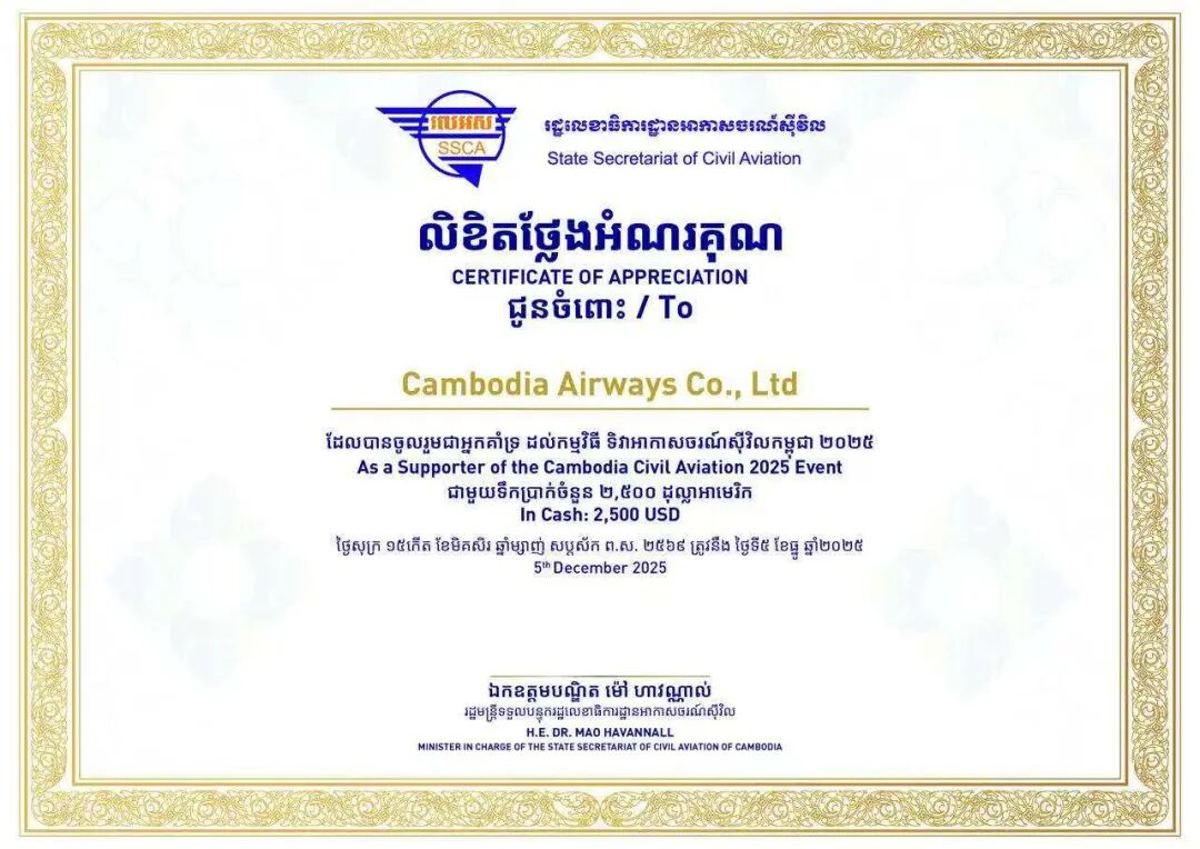 这张极具含金量的证书不仅是对柬埔寨航空近年来在航线网络拓展、服务品质提升等方面所获成绩的充分肯定,更代表着柬埔寨航空在柬埔寨民航事业发展新阶段中发挥着越来越重要的作用。