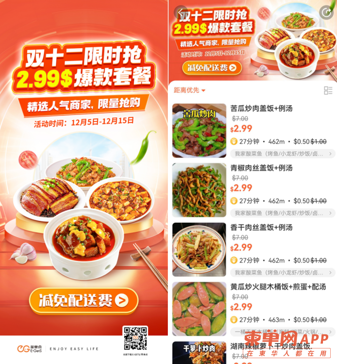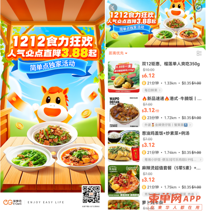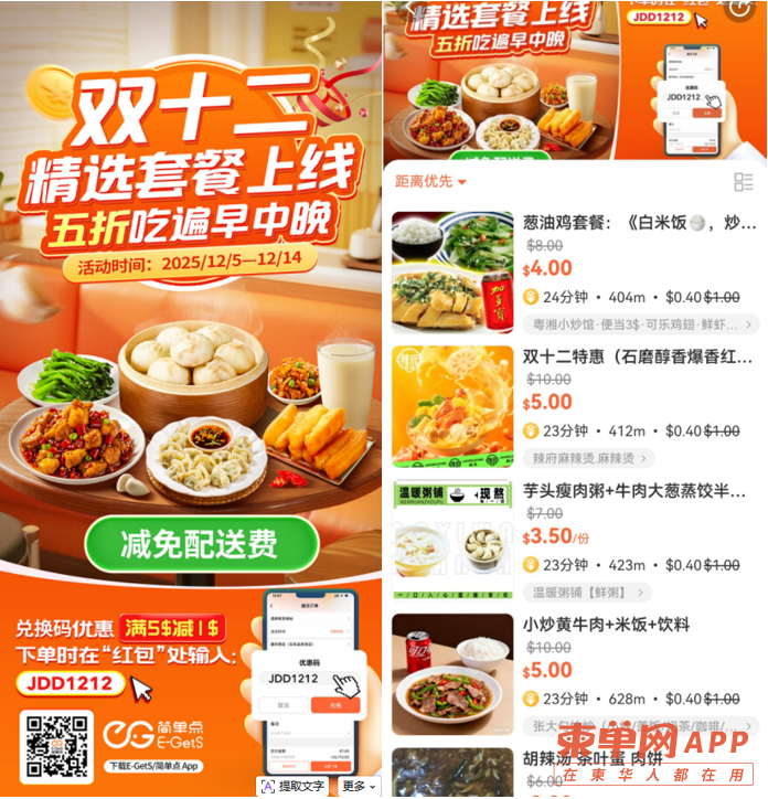 双十二福利炸场西港!E-GetS/简单点携暖心早餐、豪华午餐、满足晚餐专区强势来袭!五折馄饨、情侣专享、饮料例汤随机送……超值套餐组合让你从早吃到晚,天天不重样!下单时红包处输入【JDD1212】,领取兑换码优惠,满$5.00减$1.00!