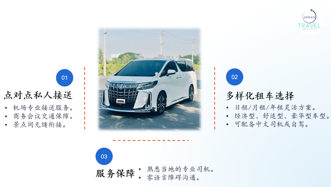 机场接送、包车游览、商务用车,车型任选,还配熟悉路况的中文司机,安全又贴心。