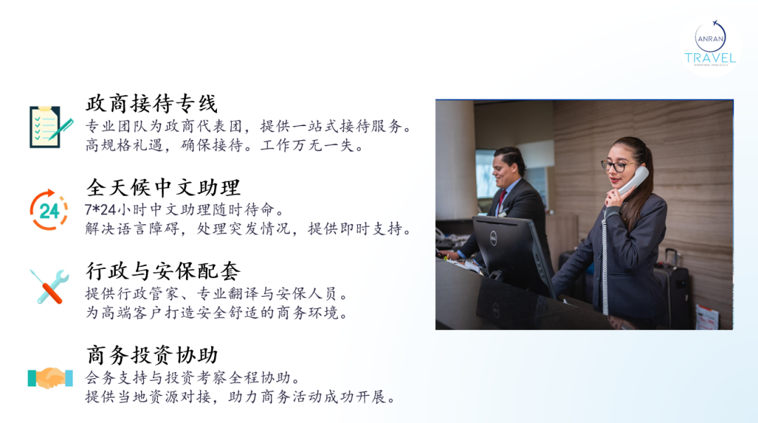 如有商务考察、高端代表团接待需求,他们提供“一站式+全天候中文助理”服务,从礼宾到安保,细节到位。