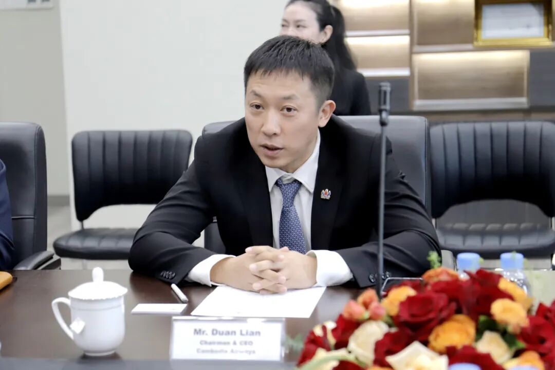 会上,柬埔寨航空董事长兼CEO Edison Duan先生代表柬埔寨航空管理层及全体员工,对林青山书记、Ly Sovannarith 阁下等一行的到来表示热烈欢迎。随后他向到访代表团介绍了公司的发展历程、航线网络及战略规划。他表示,随着柬埔寨航空航线网络和机队规模的持续拓展,公司在飞行、客舱、运行及维修等多个岗位的人才需求也日益增长,中国民用航空飞行学院代表团的到来,为柬埔寨民航人才的培养、训练提供了绝佳的机会。