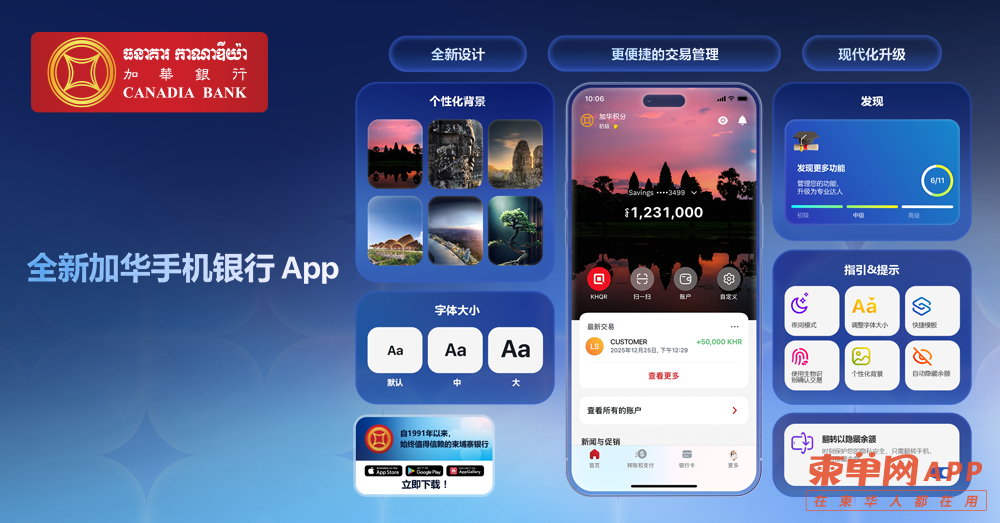 作为柬埔寨规模最大的本土商业银行之一,加华银行(Canadia Bank)近日正式推出全新升级的加华手机银行 App。该应用由银行数字与技术团队自主研发,围绕“更便捷、更智能、更安全”的核心理念全面焕新,旨在为客户提供高品质的数字银行体验,满足不断演进的金融服务需求,也进一步彰显了加华银行对创新发展与客户赋能的长期承诺。